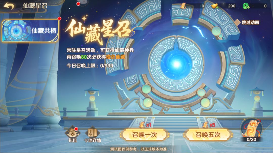 点击界面右下角的[仙藏星召]按钮后,便能在此消耗对应道具,来召唤抽取仙藏,当召唤次数达到指定数额时,还能获得额外奖励。