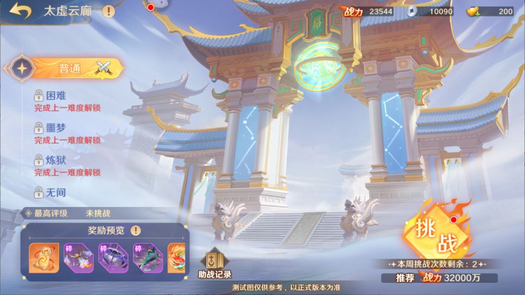 太虚云廊为周常挑战,每周一0点刷新,每周有2次挑战次数。挑战次数会在BOSS战胜利并领取奖励时消耗。挑战中途可随时点击返回按钮选择[暂离]来保存并退出,后续可在活动界面选择继续挑战,但每周奖励刷新时,保存进度将会重置,不会保存至下周。