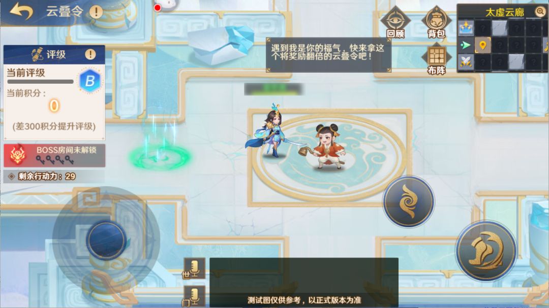在太虚云廊中,守护使将会遇到各种事件与谜题,与它们交互将有可能获得道具、行动力,同时也可能改变守护使的[积分]数量。积分会影响通关时的奖励评级,进而影响所能获得的额外奖励。当前通关评级同样可在界面左侧查看。