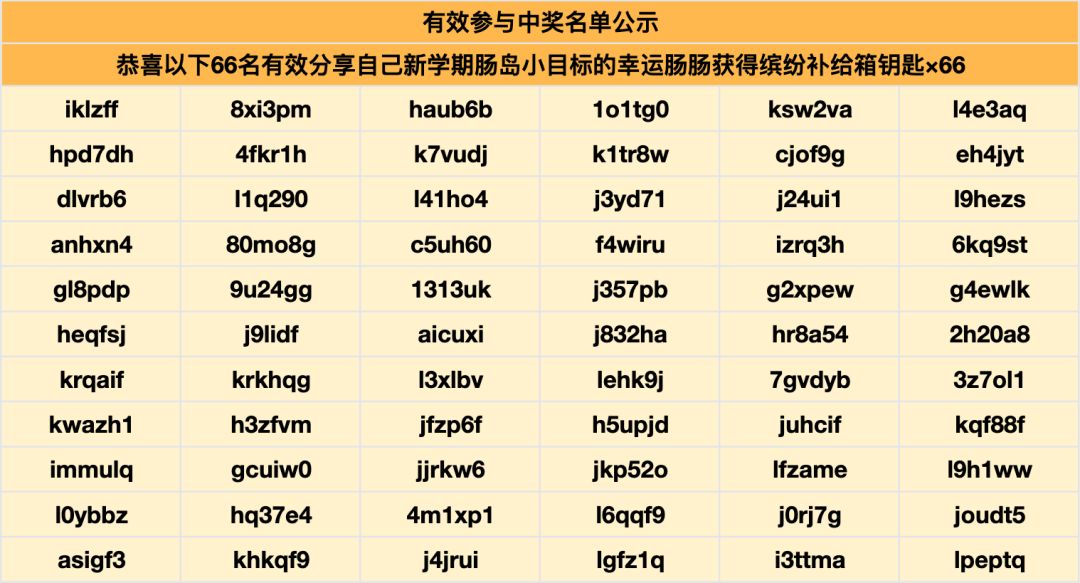 蛋卷将抽取66名有效分享自己新学期肠岛小目标的幸运肠肠送出缤纷补给箱钥匙×66的奖励!