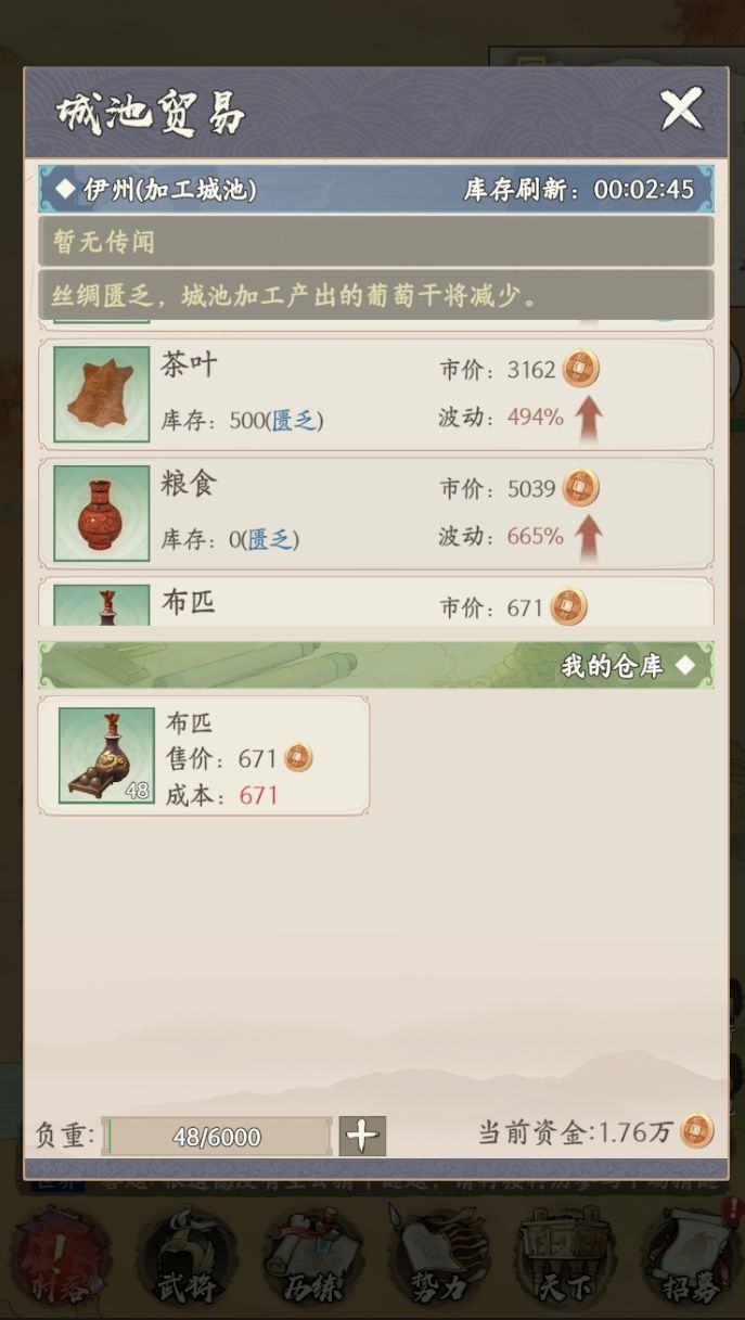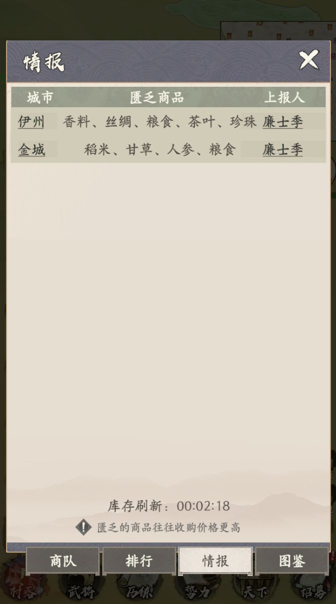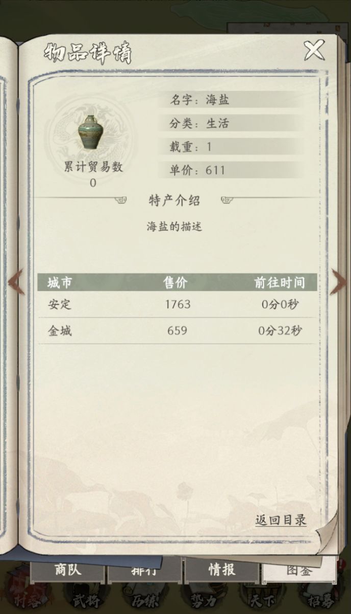 - 抵达新的城池,解锁新货物图鉴,从图鉴中获取该货物在各大城池中的售价。