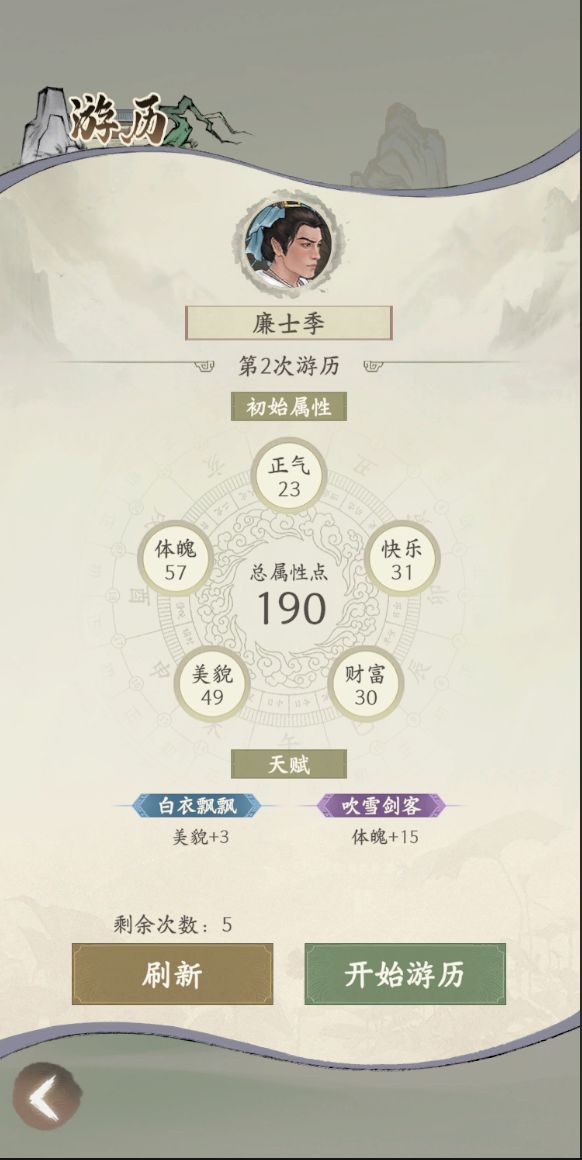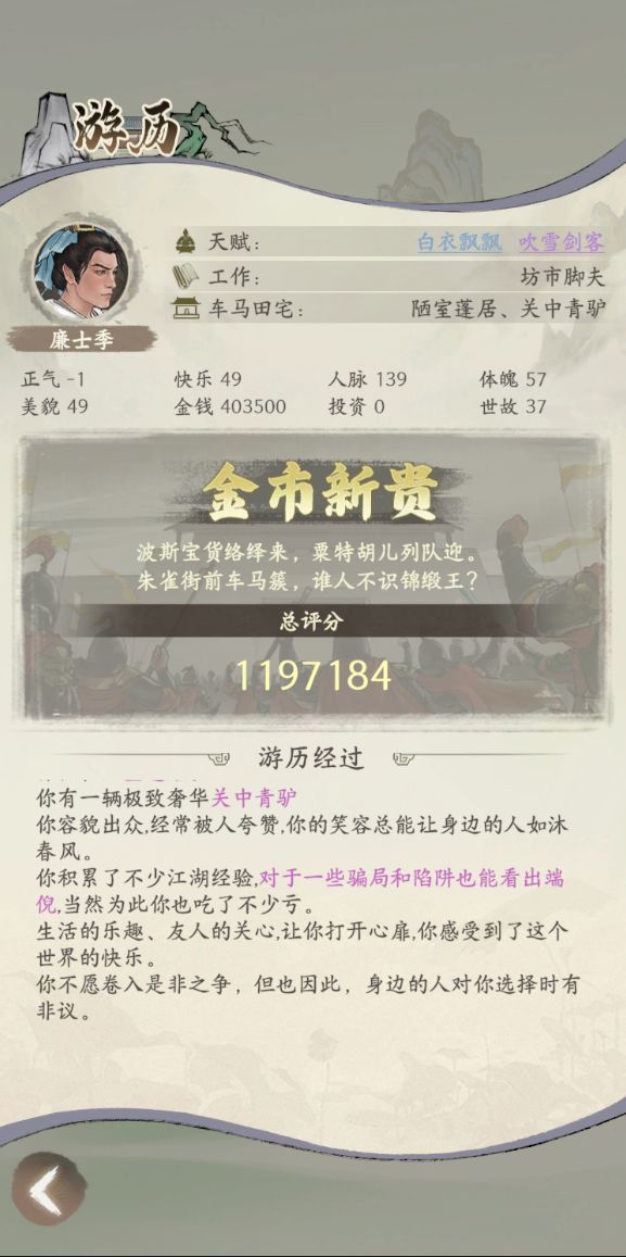 - 游历结束后,将依据获得的金钱,购置的资产进行结算评分,根据每周历史最高评分上榜