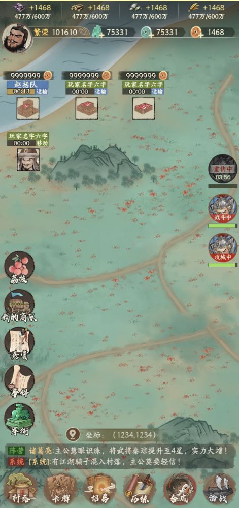 - 不再自动分配初始势力城池,各位主公们需要齐心协力,收集物资,制造攻城车,为己方势力攻下第一个初始城池。