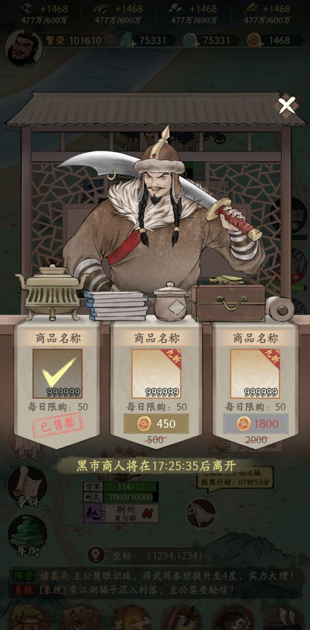 - 在天下各地中,有几率出现黑市商人,点击地图中的黑市商人,有几率招募到最高品质的武将。
