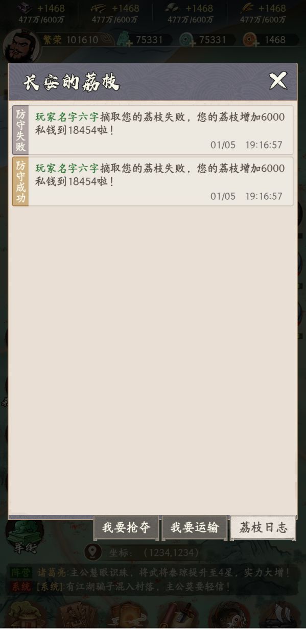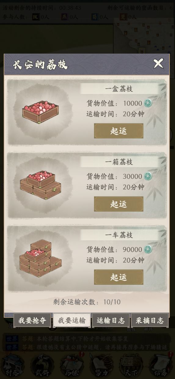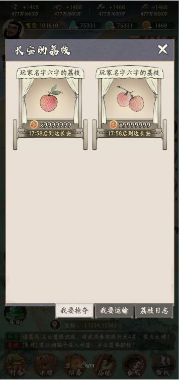 - 在运输的途中,其他玩家可以花费额外的货币进行抢夺,抢夺有较少几率成功,成功时截断该荔枝的运输,并且直接获得对应的货物价值奖励,失败时花费的货币将计入奖池,归为运输荔枝的玩家所属。