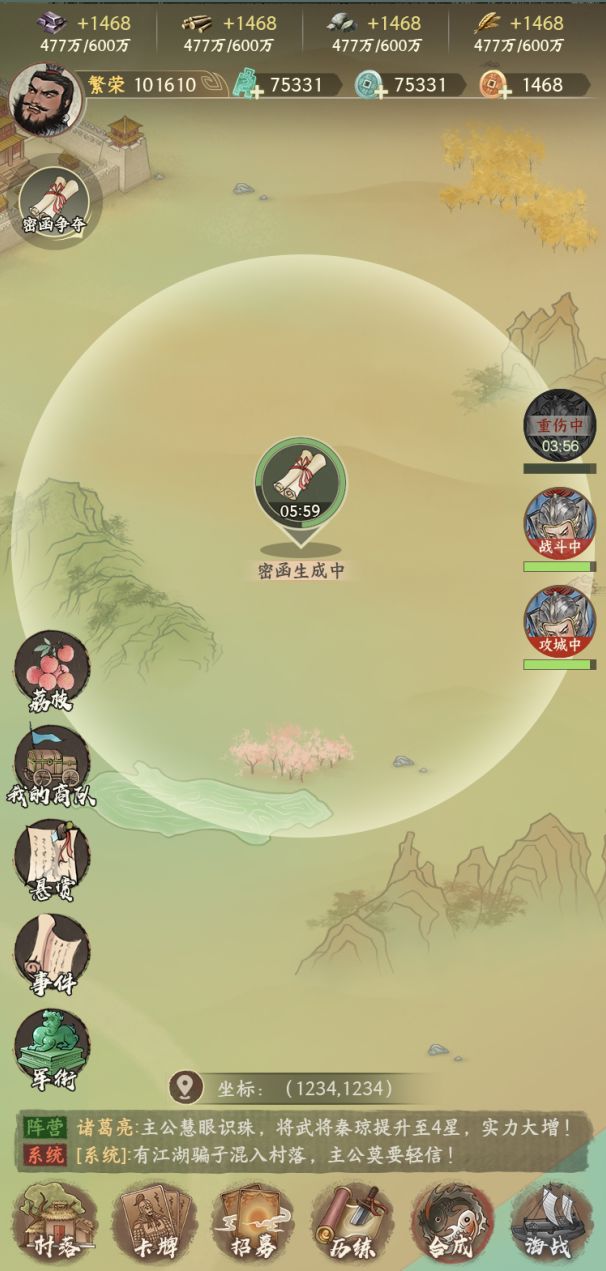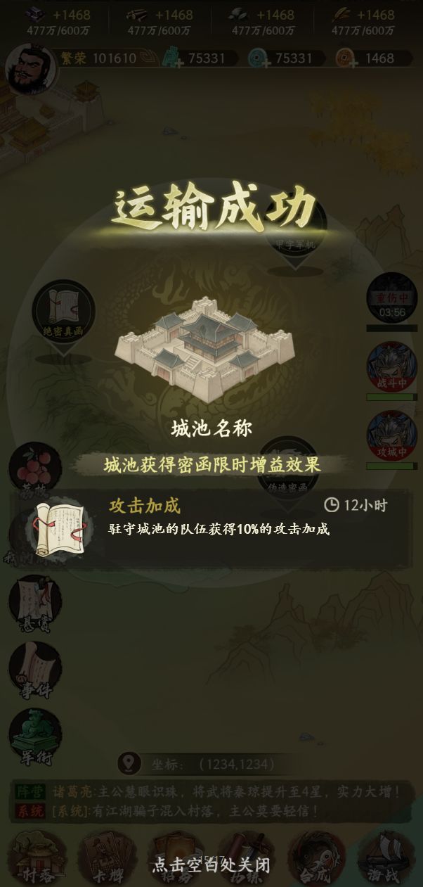 - 在揭露密函后,可派遣队伍运输指定的密函回城池,城池将获得对应密函BUFF,加强前线城池的策略深度。