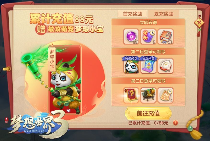 累计充值达88元,将额外获得强力敏攻萌宠梦想小宝,还有扩充宠物栏位的驾驭宝典、45级宠物通灵符、45级宠物饰物等特惠好礼相送!