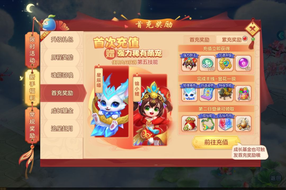游戏内完成首次充值,即可获得“千金难求”天资珍稀宠物锦小鲤,完成主线任务可再获得一只变异宠物星辰喵,更有时光轮、金币等特惠好礼相送! 购买成长基金也可触发首充奖励哦!多重奖励叠加更超值!