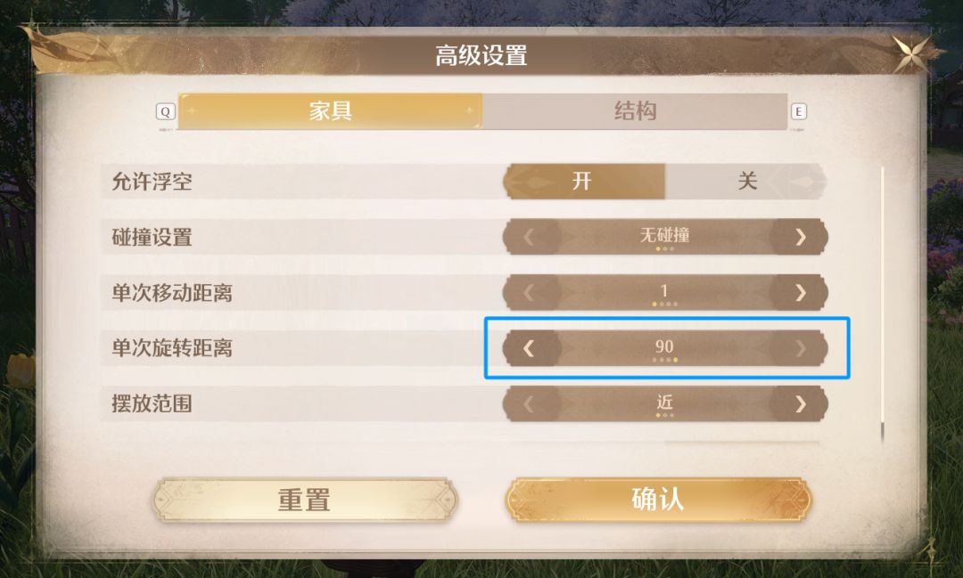 按F10可以设置旋转距离,和移动距离类似,如果想要细微调整角度,就把旋转距离改成1。如果只是想简单翻个面或者换一面墙堆放,就可以设置比较大的旋转距离来确保转完之后还能和其他家具对齐。
