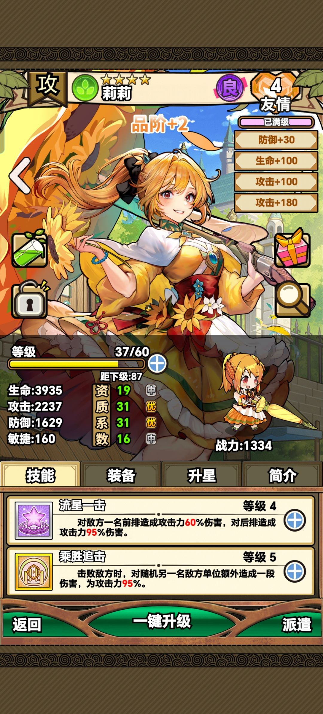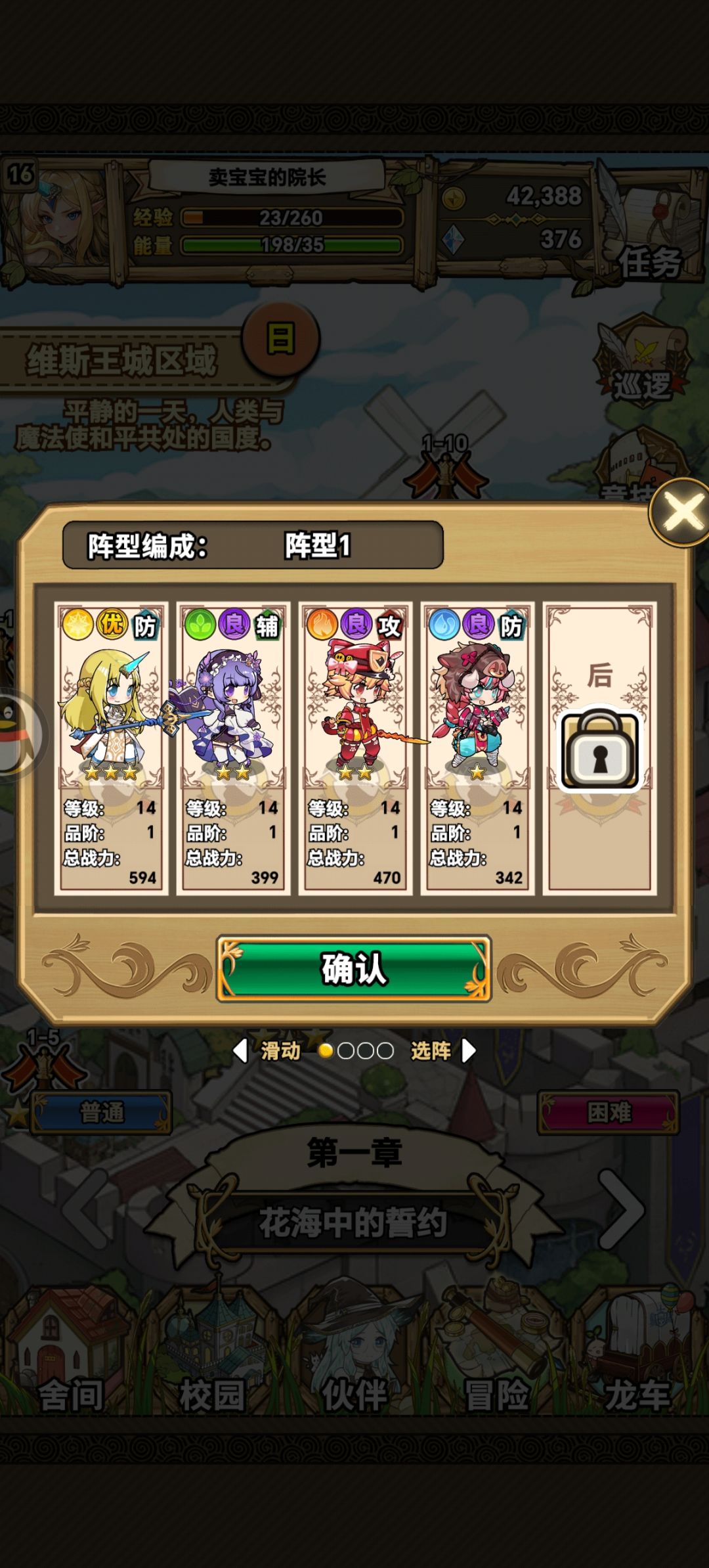 接下来我们接下来,我们继续消耗体力,使等级来到16级,接着我们再把奶妈也上阵,这时候一共有四个位置