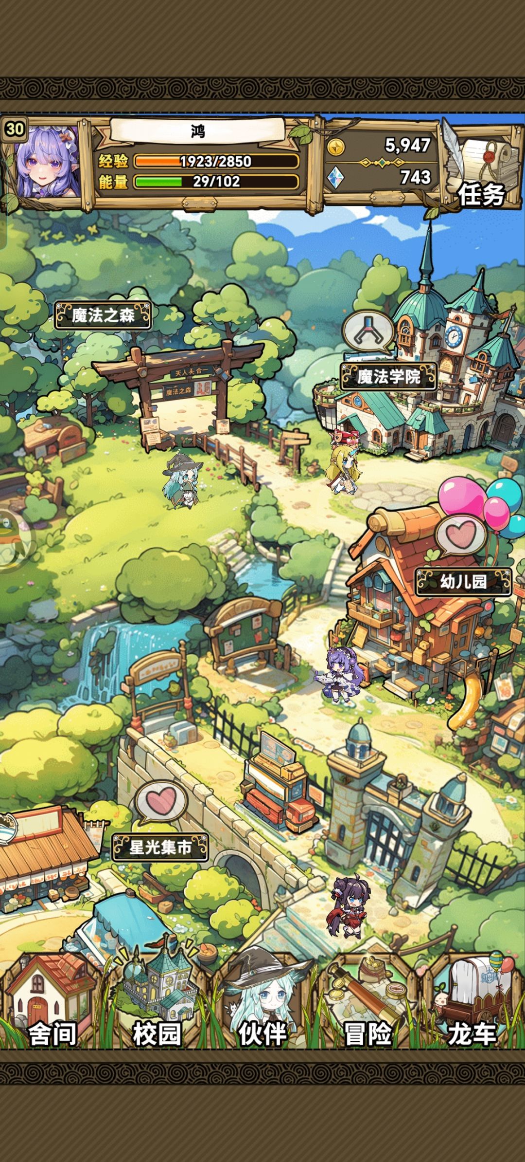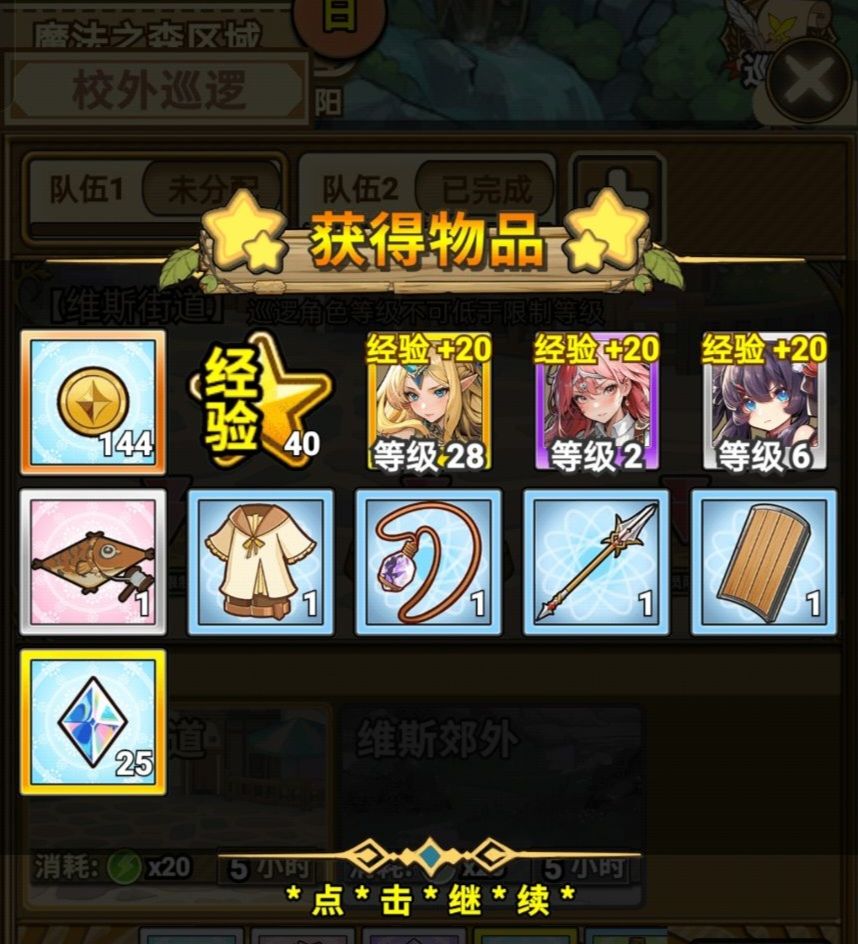 还有魔法学院的解锁,很多人都说打完2-1发现没解锁,其实有条支线需要再打一遍2-1,打完之后你才能解锁魔法学院,这里产出经验瓶也一样,只需要派人执勤就好,前期不需要升级。然后就是魔法森林,我们临课第一天,通常接触不到,也没什么好注意的,也是先不用升级。