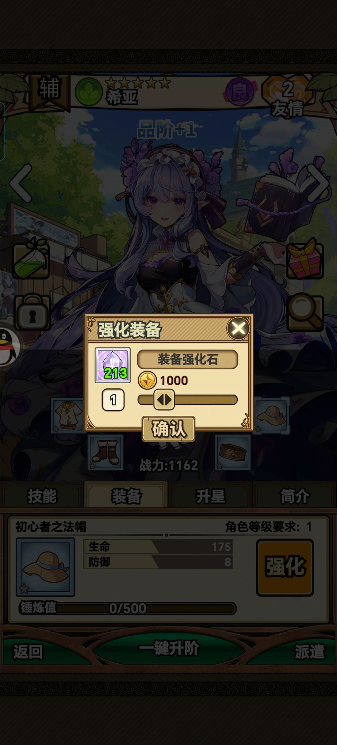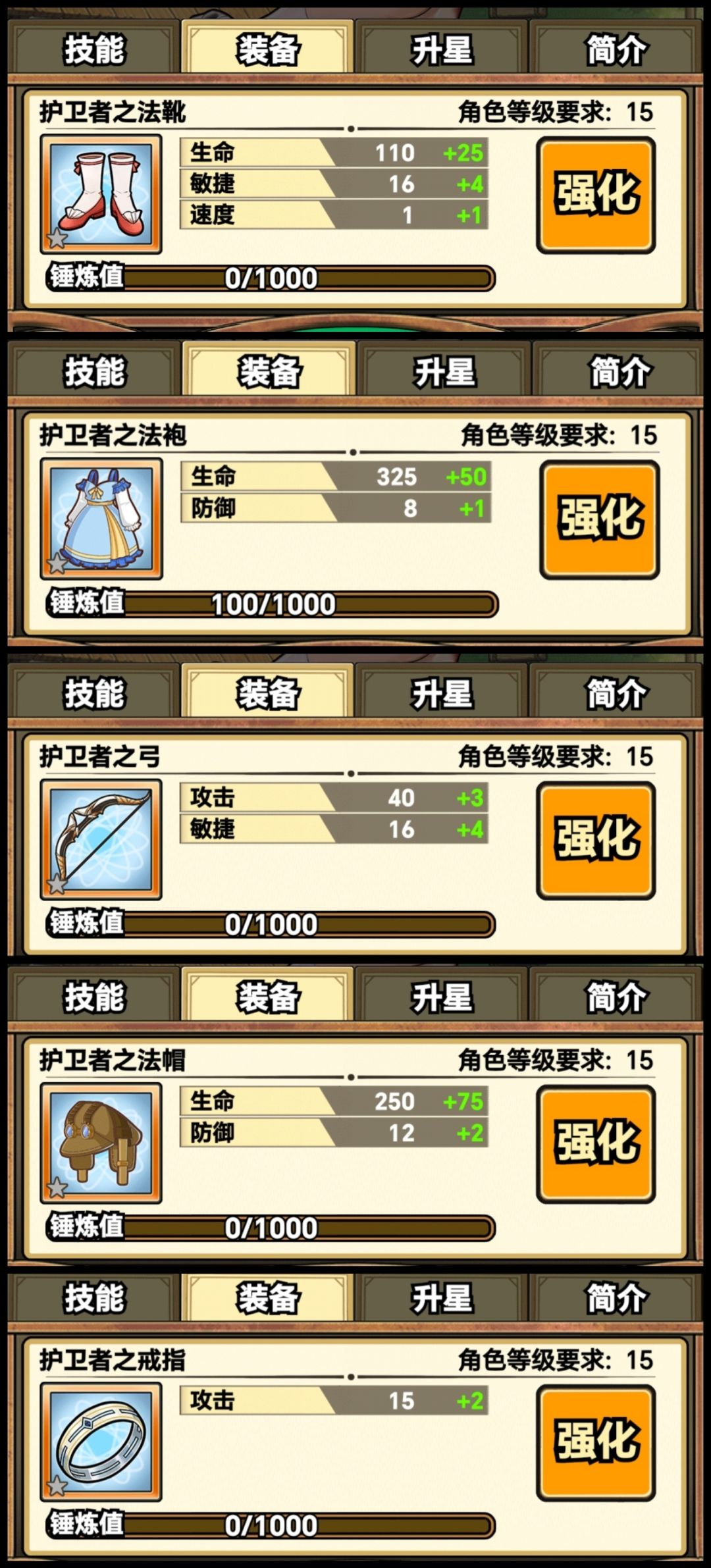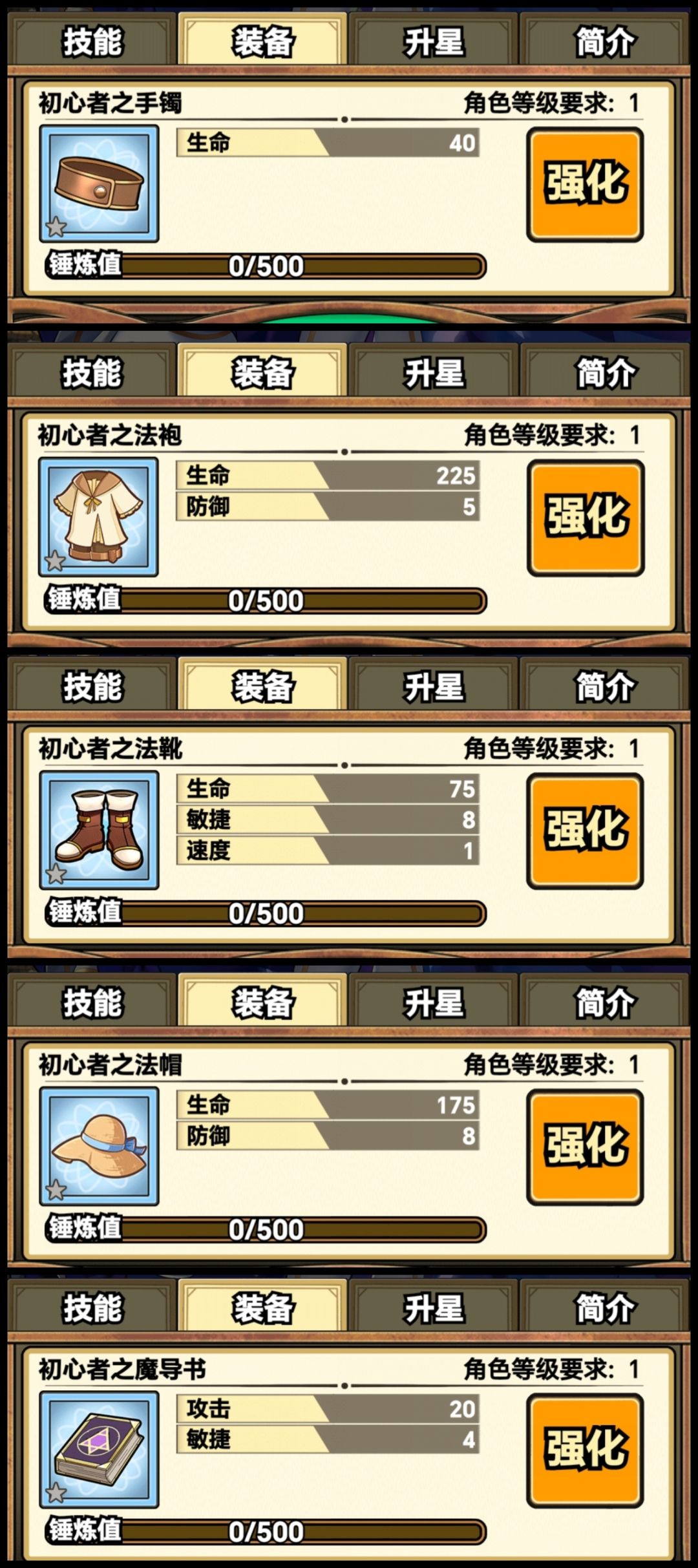 5.接下来我们就来接下来我们就来到角色的培养,首先是装备,装备是穿上就不可替换的,当你把装都给强化完后,才可以进行升阶。我个人是不推荐弄装备的,这两个图,一个是一阶装备,一个是二阶装备加的属性,其实不是很多,而且强化非常贵,一阶一位角色六件装备,一件强化需要5000十五个强化石,二阶一件就是1万和十个强化石,一阶升二阶一共需要3万,2阶升三阶要6万,在金币紧缺的这个时候,我不推荐用装备,我们只需要穿最基础的一阶就行了。