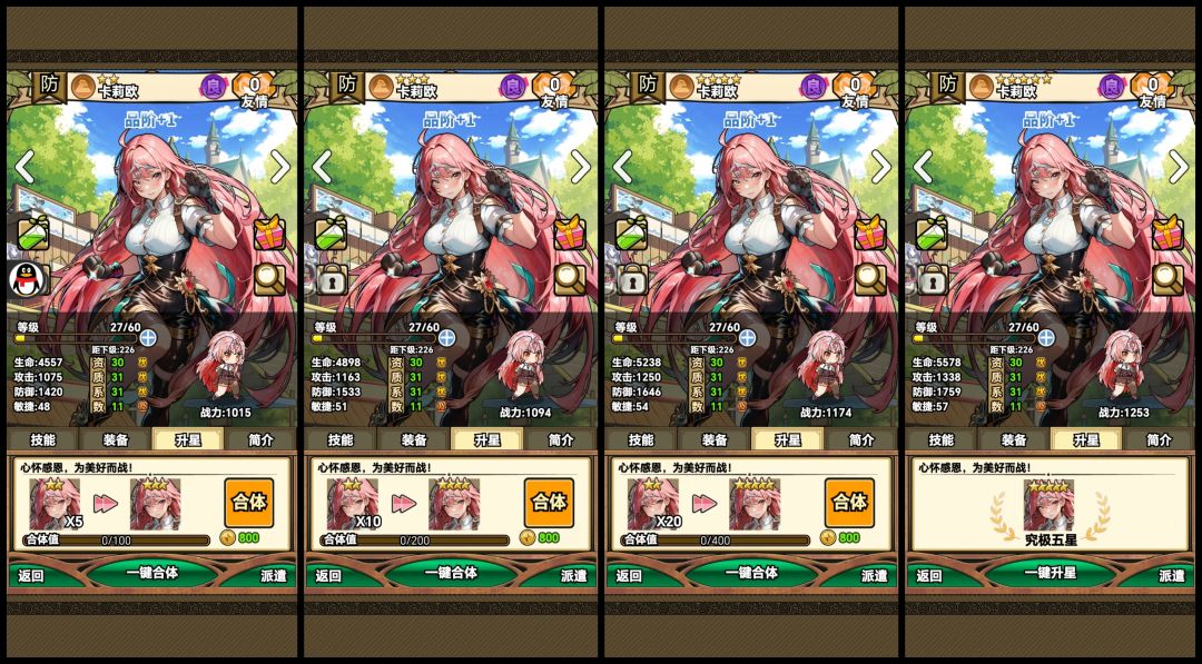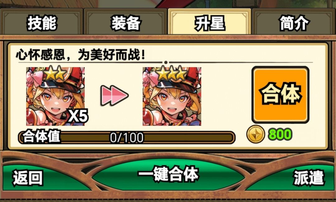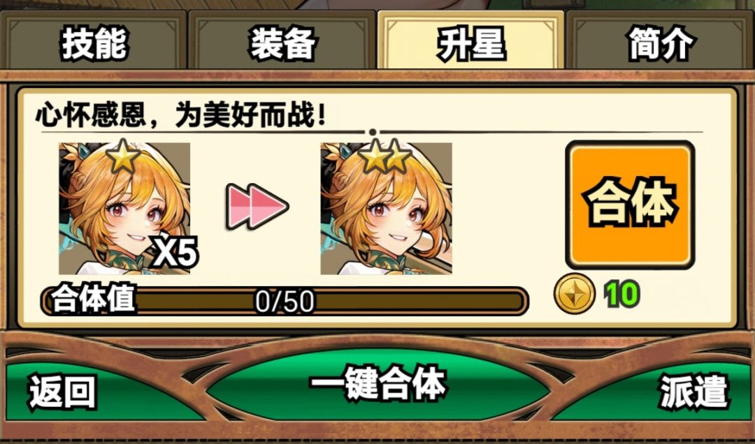 接下来是角色升星,角色升心的提升是相对于装备而言比较简单,而且比较节省金币,需要注意的是,一个一星为本体的角色升级到五星一共需要算上自身76个本体既1+5+10+20+40,一个本体为二星的角色需要36个既1+5+10+20,三星为本体一共只需要7个既1+2+4。角色每次和一个本体的时,都需要消耗一定的金币,一星本体角色每一个本体合成要十个金币,二星是800个,三星则是1万。三星我就不展示了。