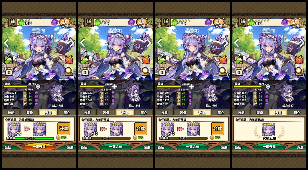 升星身心所带来的角色加成非常明显,穿一阶装备所带来的提升约等于升一颗星,二级装备则是1.5颗星,三阶大概也就是两颗星多一点