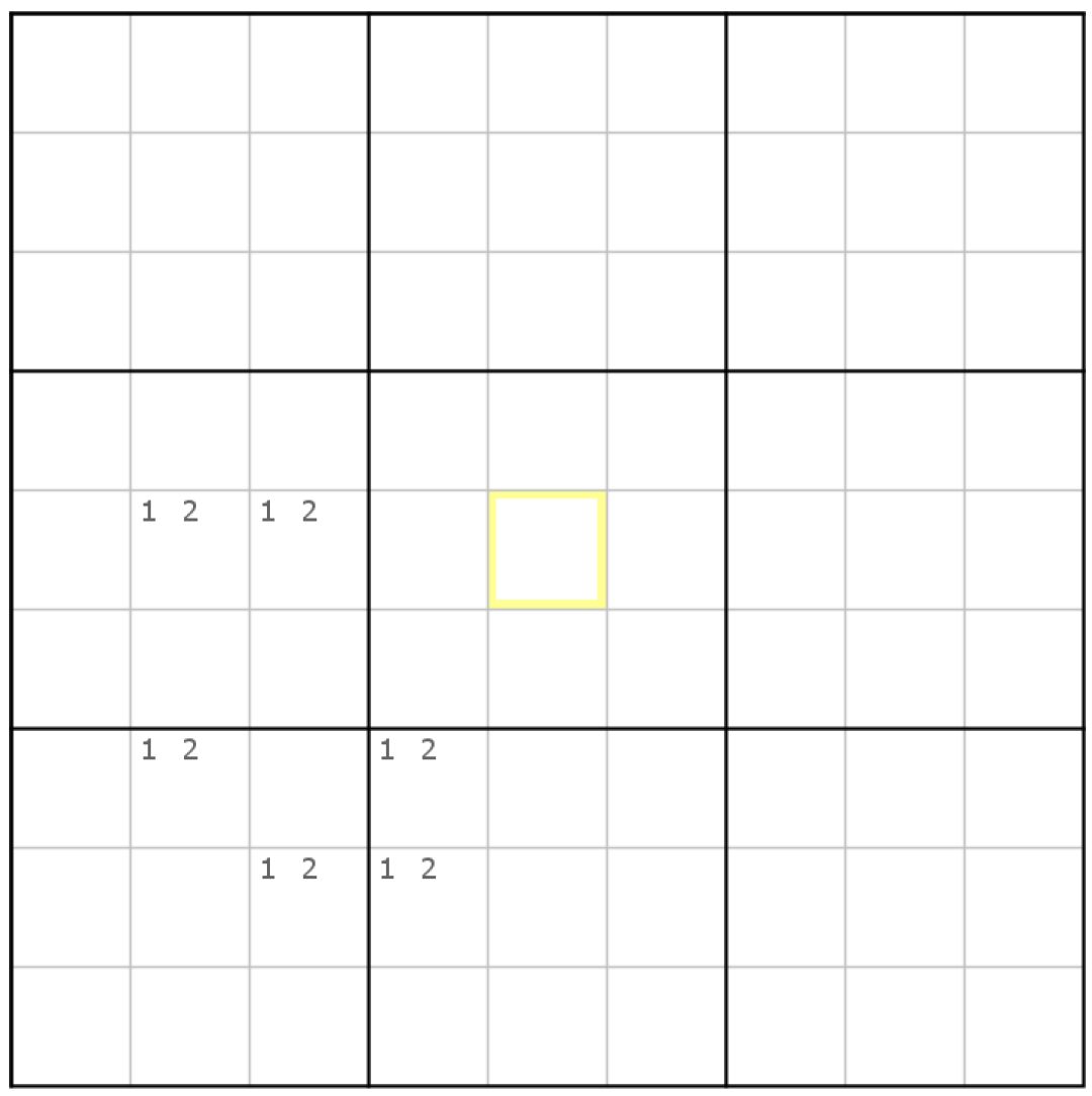 第一种如图7-2.5.1所示,它包含6个单元格,分属3宫,且涉及3种候选数。