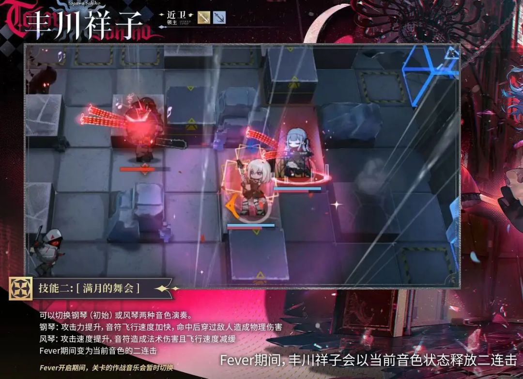 丰川祥子持续攻击且每次攻击演奏追踪敌人的音符, 音符飘出攻击范围一段时间后消失。每存在一个音符, 母鸡卡成员无视敌人一定比例的防御力和法术抗性(有一定层数上限);技能期间远程攻击不再降低攻击力