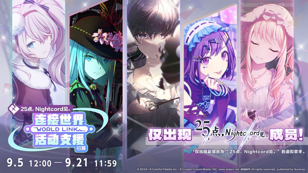 此为9/12起预定举办的“[25点,Nightcord见。]连接世界活动”的支援招募,仅会出现[25点,Nightcord见。]的成员(包含副组合为[25点,Nightcord见。]的成员)。