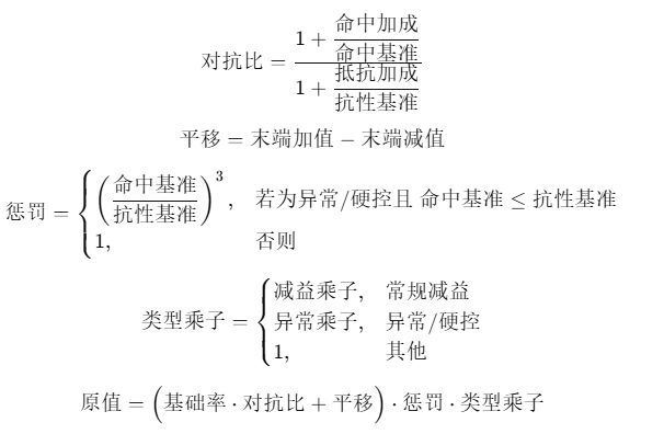 在此基础上,需叠加末端“加值与减值的代数差”进行平移调整。需特别注意,异常状态与硬控类效果在命中基础值低于抗性基础值时,将受到基于差距立方关系的严重惩罚。
