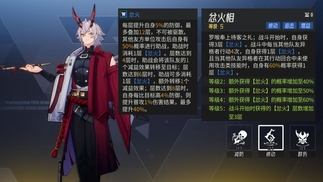 被动是罗喉的主要机制,队友攻击时会消耗一层忿火追击,根据忿火层数造成不同效果,推荐升至4级后追5级