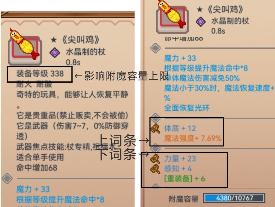 装备附魔容量,比如图中尖叫鸡的4380/10767,前面的数字是这件装备现在的词条占用的部分,后面空出来的是可以继续改造的部分。附魔容量的条全蓝了就不能改造,需要通过一些手段提高上限。