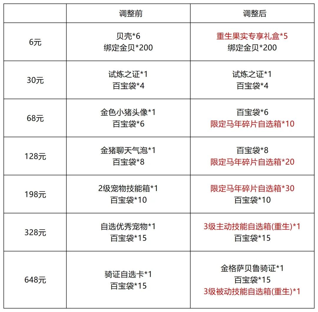 6、充值焕新!更新后所有玩家充值界面将焕新为全新充值赠送活动,首次充值6元/30元/68元/128元/198元/328元/648元档位可获得包含3级被动技能自选箱(限重生宠物可用)、3级主动技能自选箱(限重生宠物可用)、重生果实在内的全新奖励!