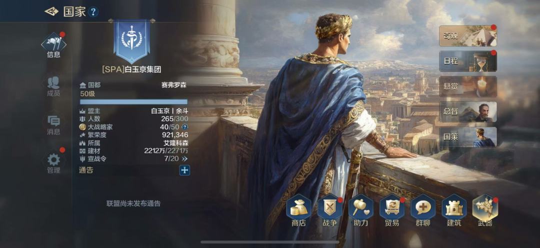 余斗:大家好我是白玉京盟主余斗,我们盟是二批次的,目前有6个团。分别是凌云、玄甲、破浪、白玉京、洗浴、燎原。我负责联盟的日常、内务、财务、外交、规划。