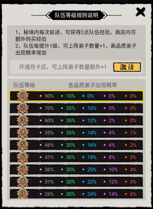 另外,每次前进可提升队伍经验,刷出高稀有度弟子的概率会随队伍等级的提升而逐渐提高哦~