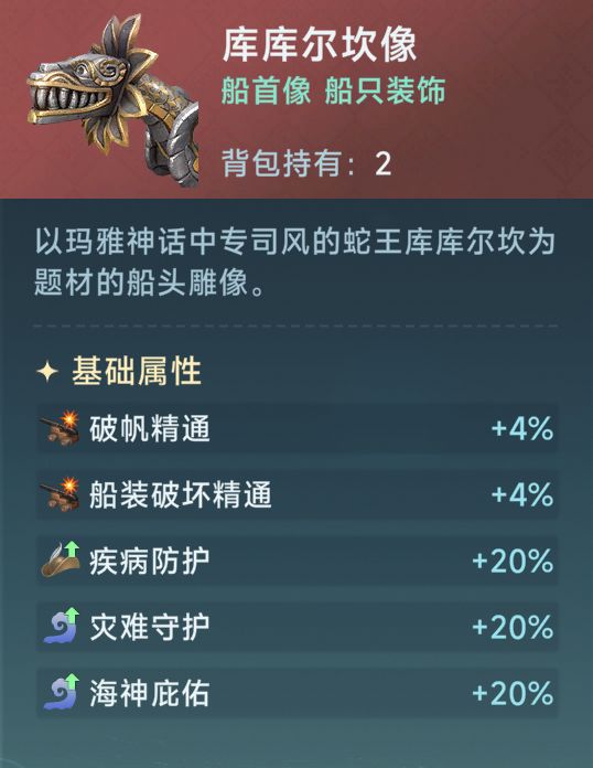 船首-库库尔坎像就是这样的神器,这个船首大大加强了链弹炮的作用,可以把敌人船装快速破坏带来强力debuff,帮助己方团队快速集火秒人。库库尔坎像船首有着核心的破帆精通+4%和船装破坏精通+4%的功能,完美契合链弹炮,是链弹炮的顶级专属船首,主要是通过至尊秘宝抽奖获得。