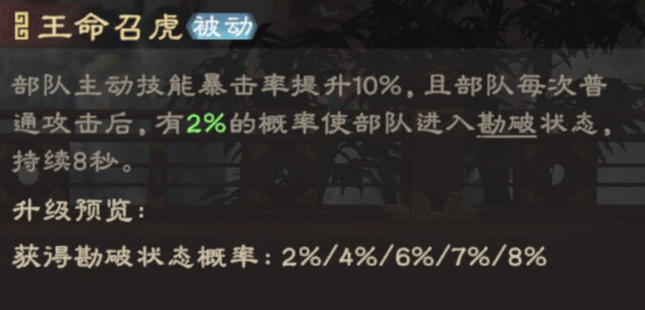 该被动可以提升主动技能的暴击率,同时提供勘破状态。勘破状态效果为:不会受到技能伤害和部队控制效果(缴械、沉默),非常强力,能有效避免对面技能爆发和控制效果,提升自身生存能力和稳定输出的能力。