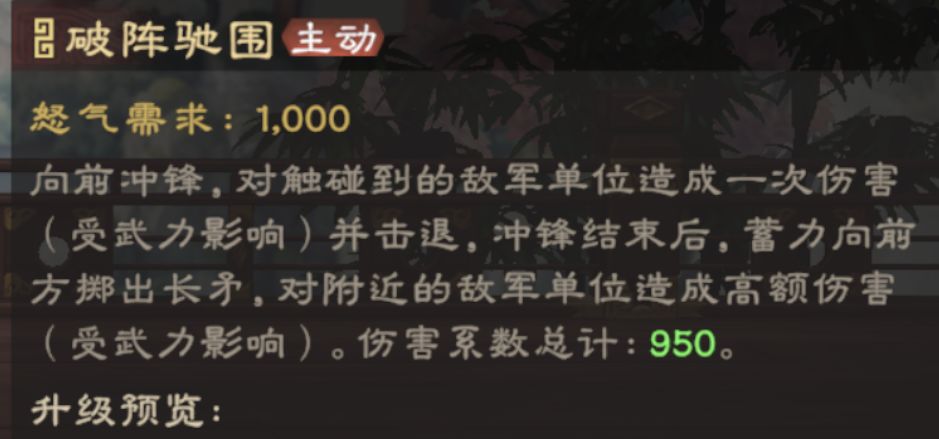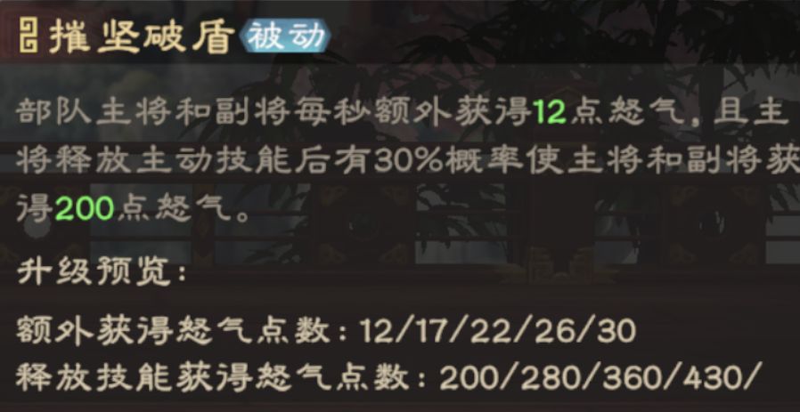 该被动可以大幅提升怒气获取能力,提升怒气循环,更适合搭配高伤害的技能体系类武将,能持续大规模输出技能伤害。