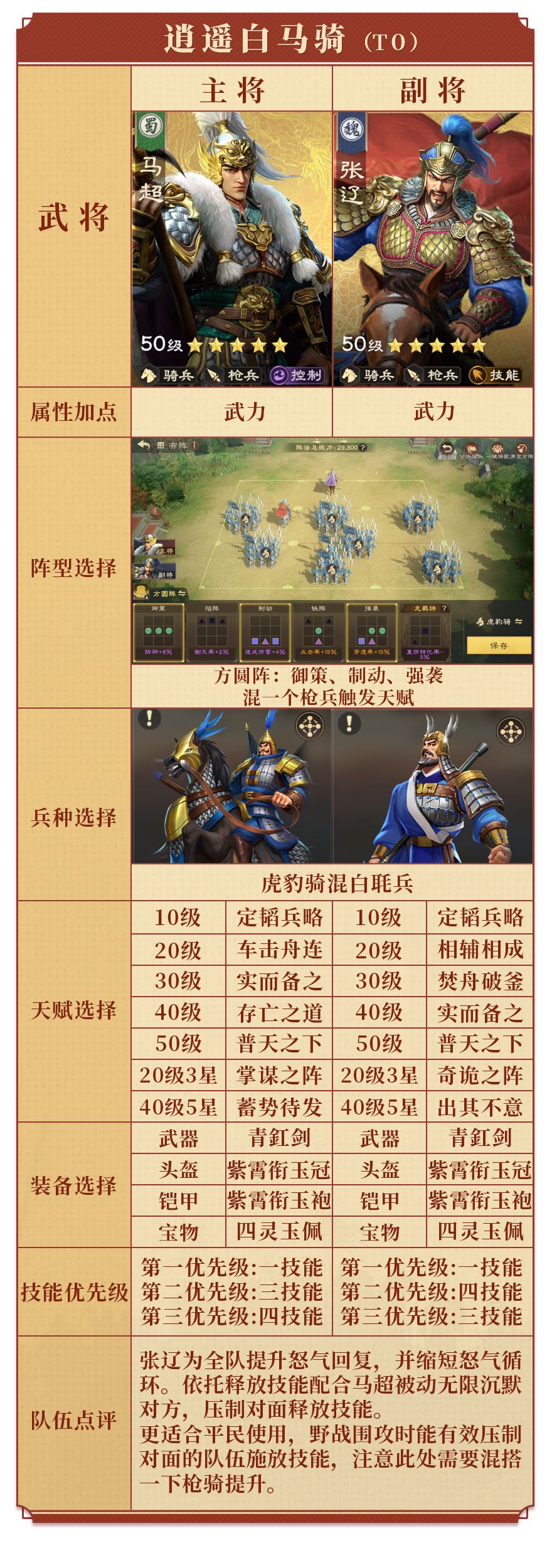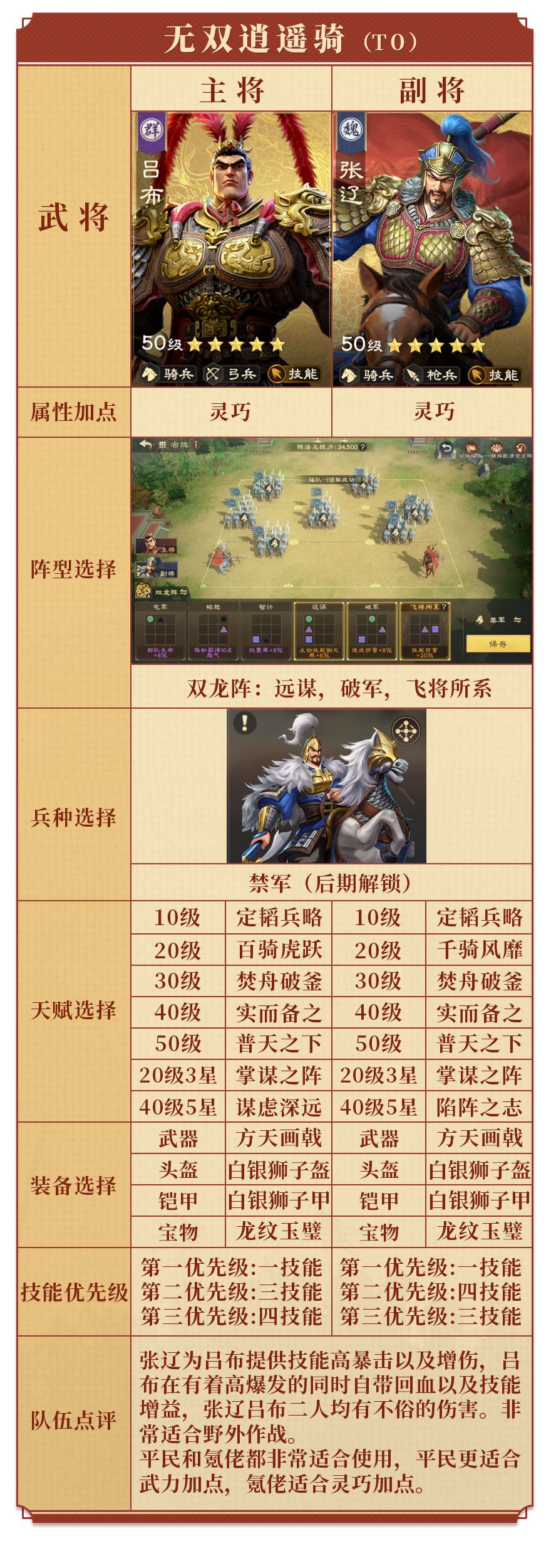 率领枪兵和骑兵时防御将会提升,因此张辽适合搭配枪兵和骑兵,需要搭配其他适配骑兵和枪兵的队伍。