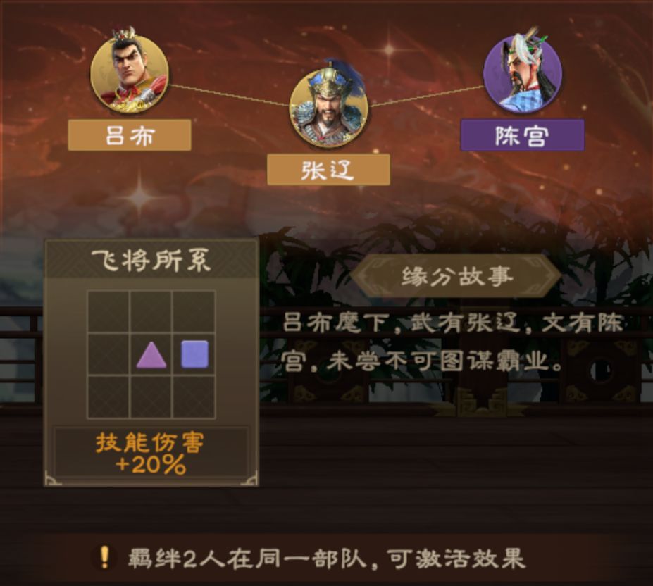 两者同时拥有飞将所系的羁绊,可进一步提升技能伤害。