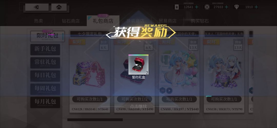 七夕限时礼包,小氪只建议购买誓约礼包×2,其余不推荐。氪佬随意可全买。