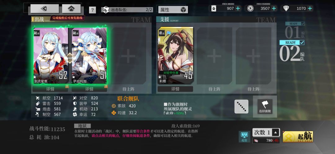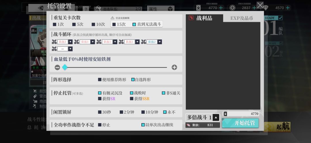 这次活动前期我选择地狱EX6战2油点,保底捞,托管编队配置如下: