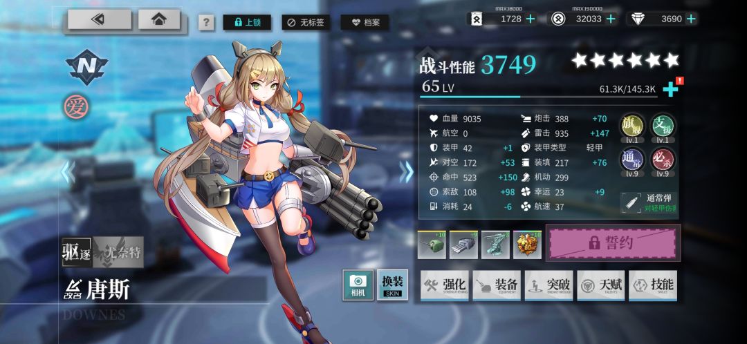 指挥官等级LV.63,推图进度主线13-5、主线困难11-1,海军中校,争锋竞技92.79%。