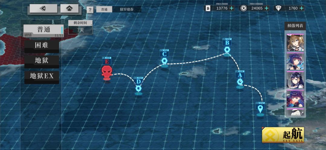 SSR 赤城还差1个,5-10就毕业了,之后每天只需要刷困难10-5即可。