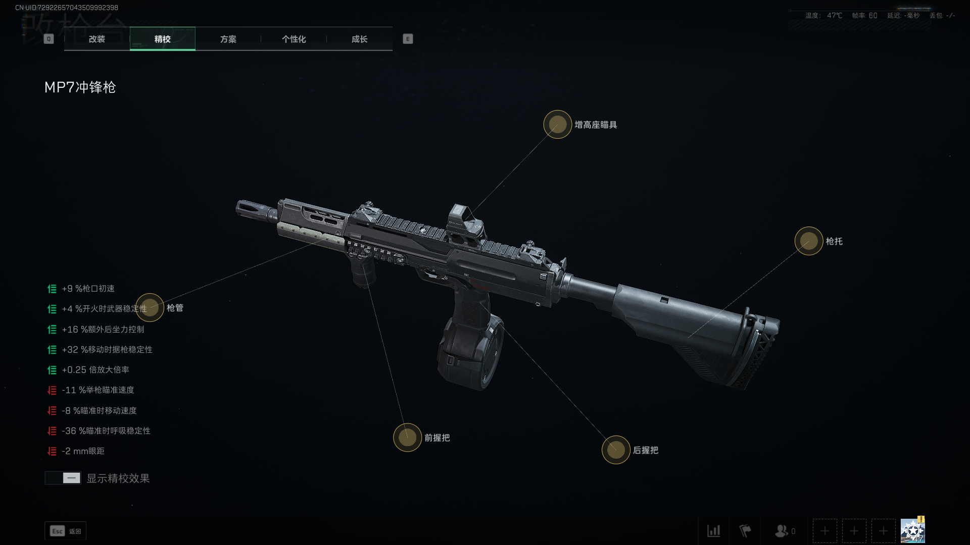 根据我的这套精校,MP7可以获得+4%开火时稳定性,+16%后坐力控制和+32移动时据枪稳定性。