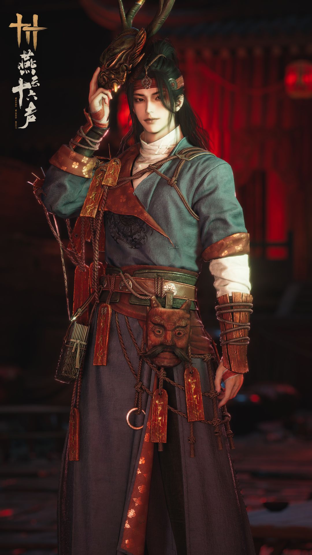 此衣承古傩之仪,取“以戏通灵”之意。衣色以墨蓝为基,内衬饰以精巧花纹,初见格外干练洒脱。而最引人瞩目之处,乃是周身有麻绳缠绕木制护甲,挂着刻印符牌、威严傩面,自有一身令人望而生敬的古朴庄严。腰间古书《灵台秘苑》,更是彰显其占卜吉凶、术数观星之能。走江湖的人,谁不想和这样一位能趋福避祸的异士同行?