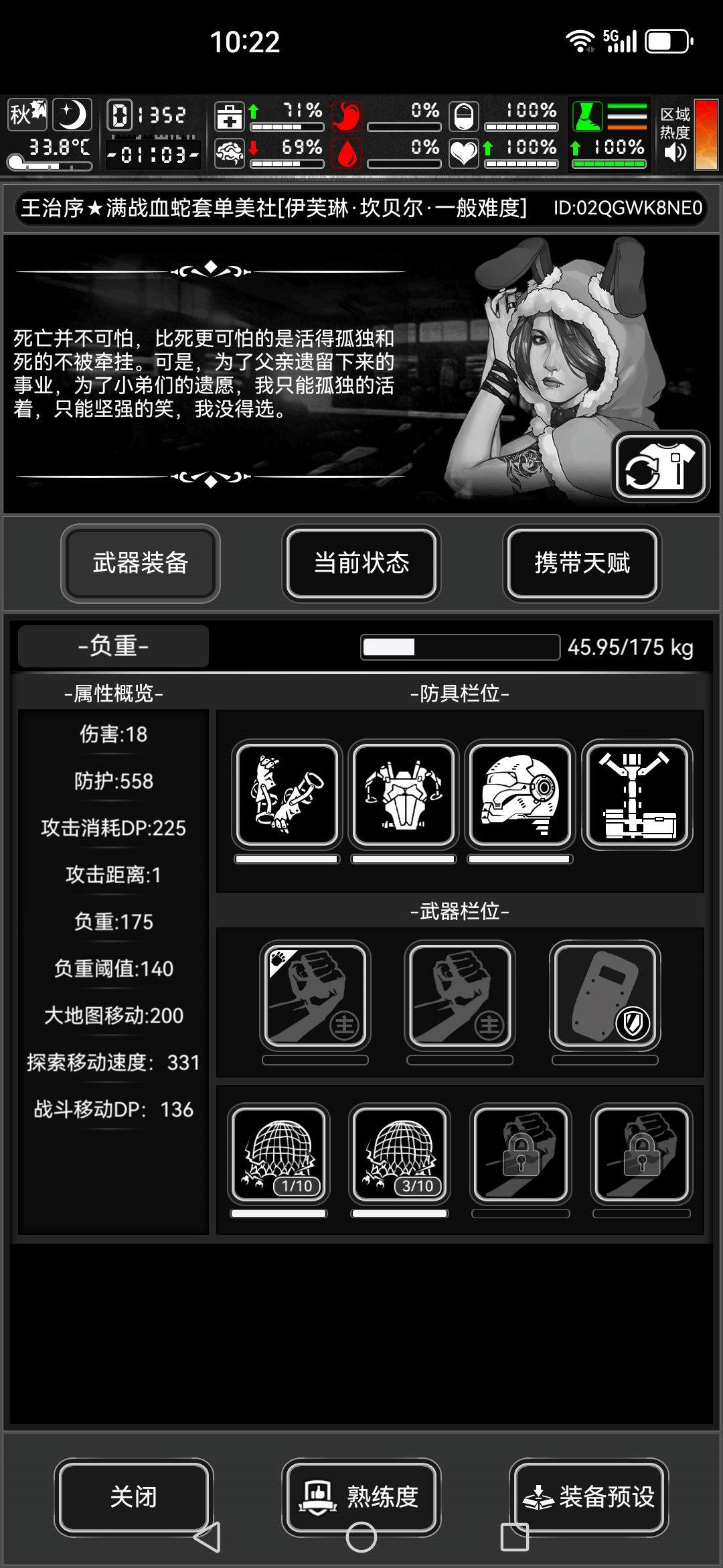 大概配置是:百格档碳刀(带碳刀鞘)+稍微改装了一下骨套+满战+四阶sg+八级眩晕天赋+满级熟练度。因为我的配置有点高,所以不具备萌新参考价值(主要是我总不能把天赋下了再打吧,那样的话就是无天赋版本的