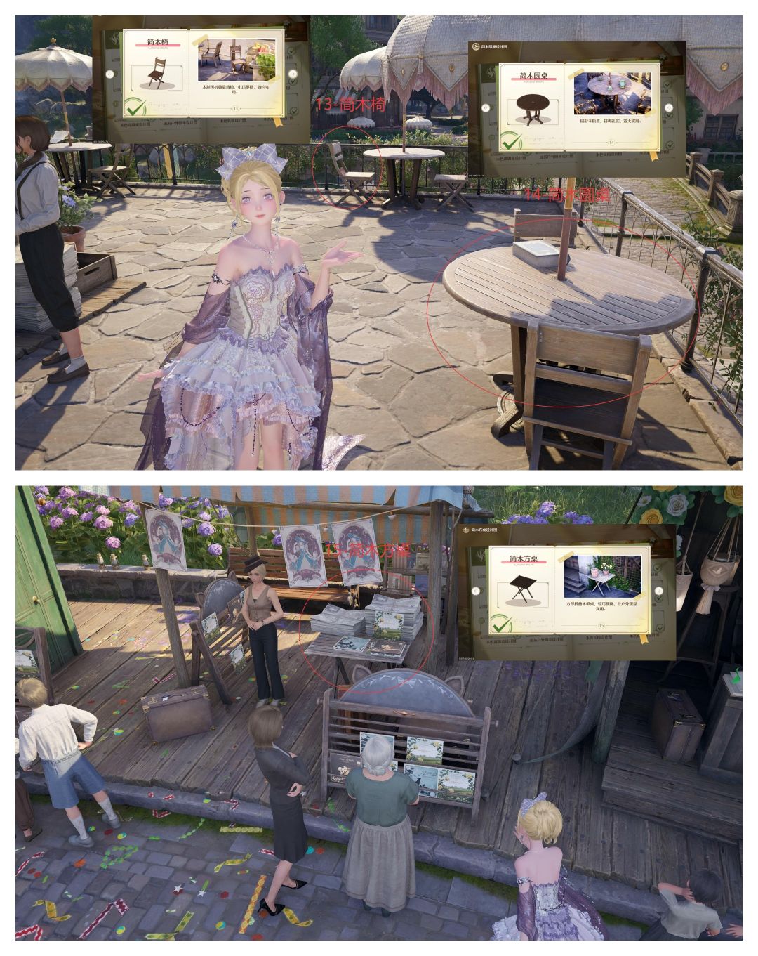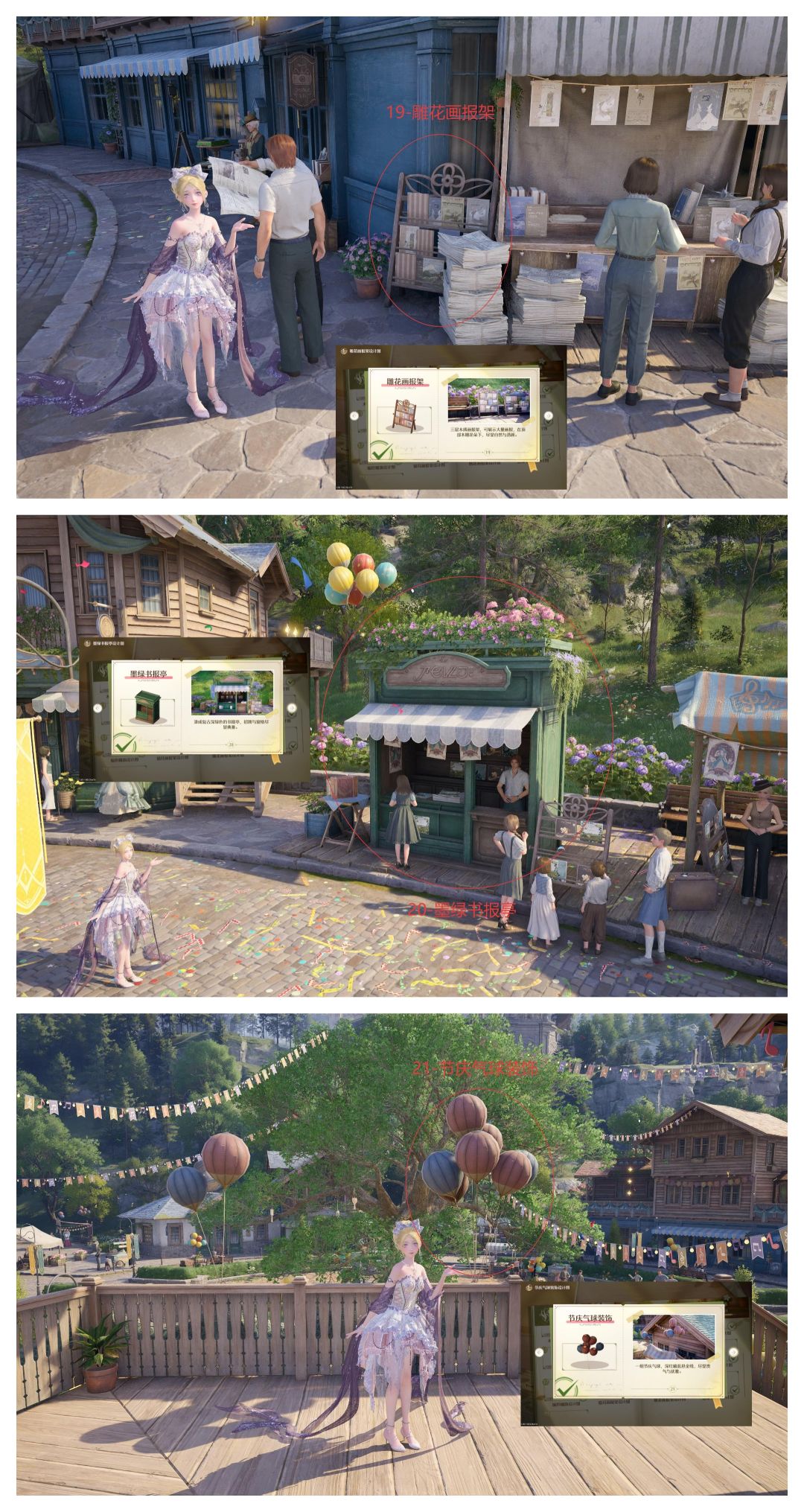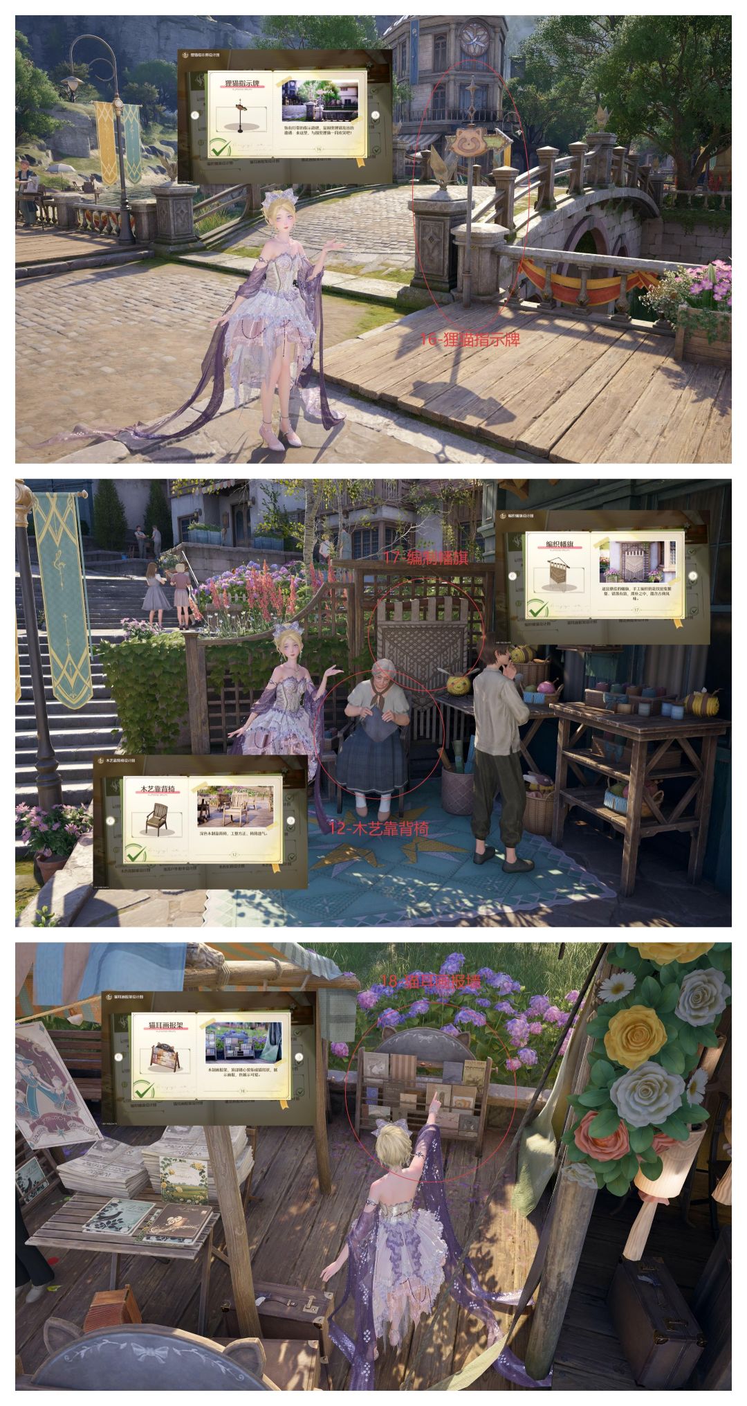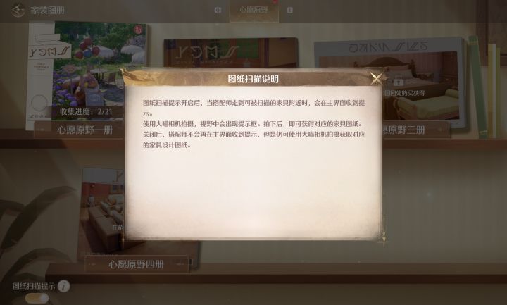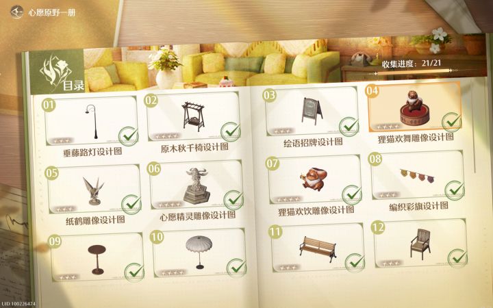 心愿原野一册一共21件家装设计图,还是挺容易集齐的,围着大许愿树广场转一圈就齐了,不涉及屋内,都是屋外的。一时间找不到的也可以点进家装图册,点击设计图查看示例图所在大致位置。相同的家具在不同的地点都可被识别,不用找一模一样的地方。