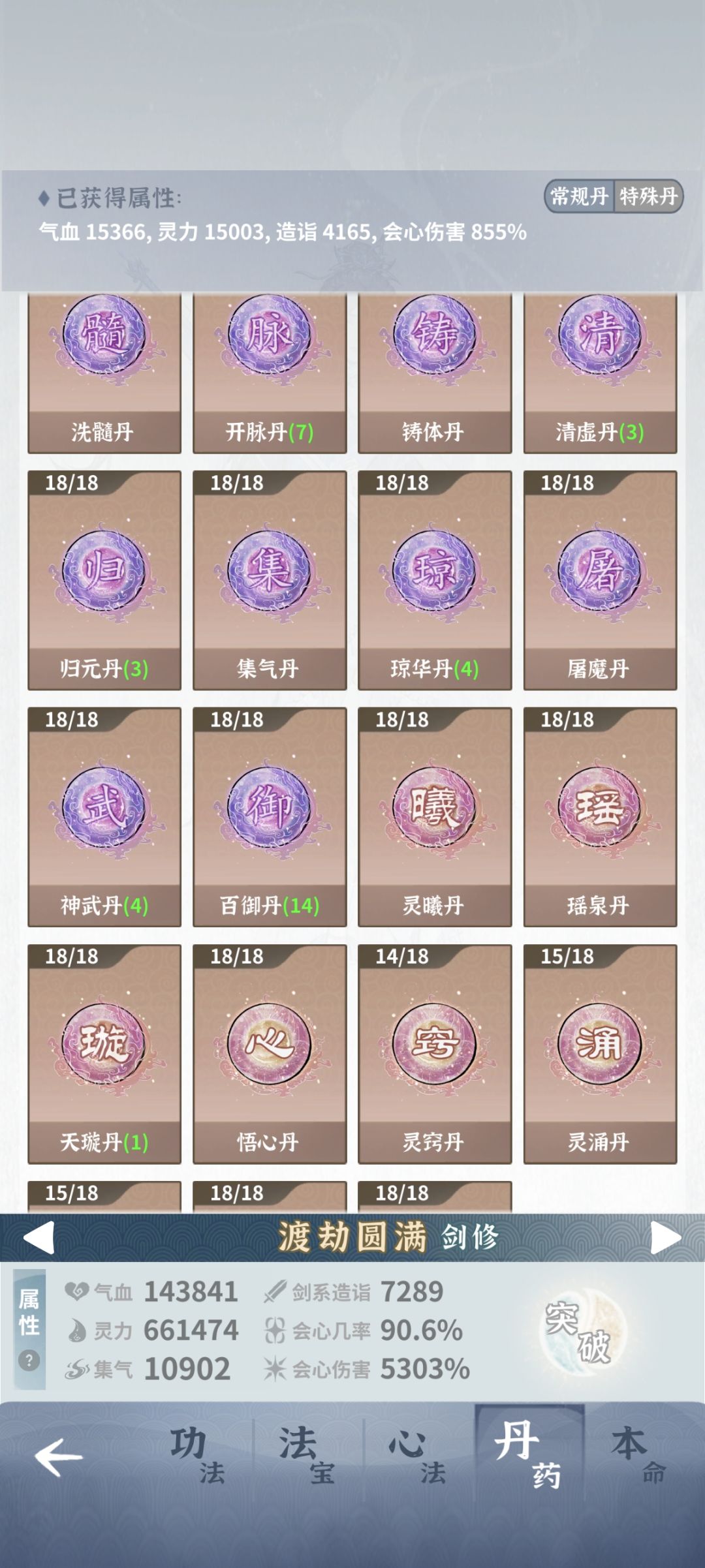 本命位置放的是天剑和问心,心法除开几本必带之外,无非就看谁提供灵力多,带金衍和太玄就是这个原因