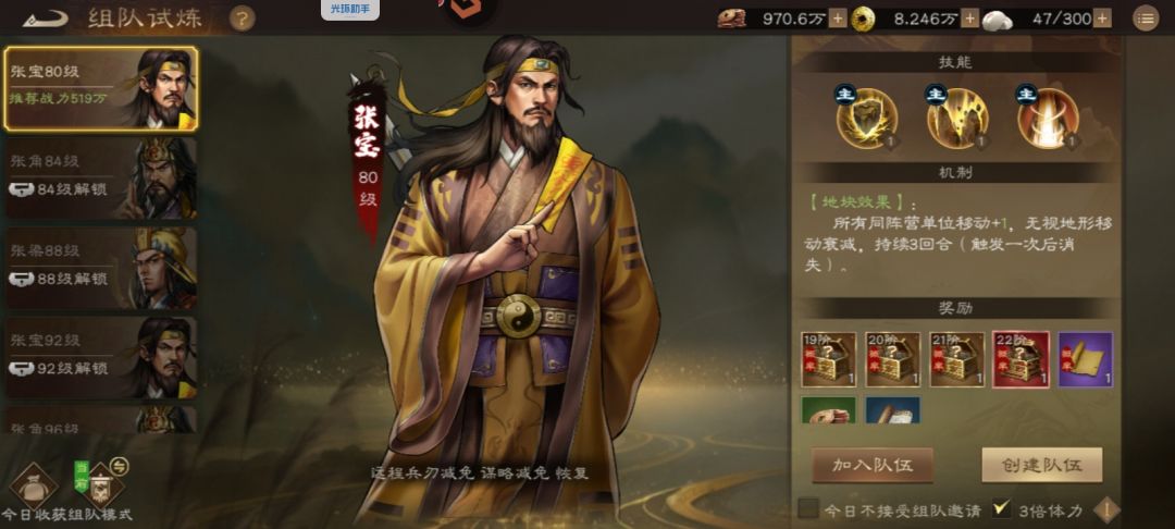 80级是一个比较重要的等级节点,可以爆22阶兵书,属性及技能又迎来一波提升,所以我们前期一定要囤一些包子,用来刷22阶兵书,根据我自己的测试数据来看(分多次不同时间段),22阶兵书大概爆率6个包子1本,5%—6%的样子,所以我们最好预留150+包子来刷22阶兵书,当然只是我的个人测试数据,盟友里也有比较欧的,<4个包子1本,也有比较非的>10个包子1本,有兴趣的可以算一下,这里大致讲下算法:20点体力刷一次铜币是5600,组队试炼左下角有个今日收获,可以查看当天爆了多少兵书,得了多少铜币,用总的铜币/5600=刷了多少次/3=用了多少包子。