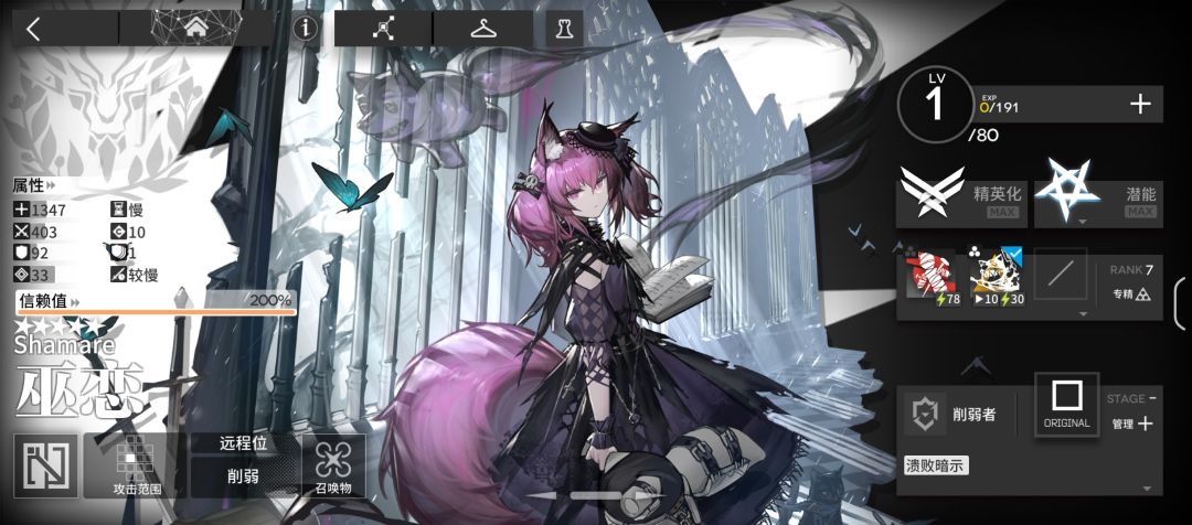 巫恋二技能可以提供一个可部署的玩偶削弱玩偶周身八格敌人50%的防御和攻击力