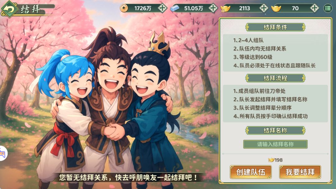 行走江湖是不是总想找几个一起刷怪、一起团战的好兄弟?现在机会来了!全新的“结拜系统”即将上线,支持最多6人义结金兰,从此江湖并肩同行!