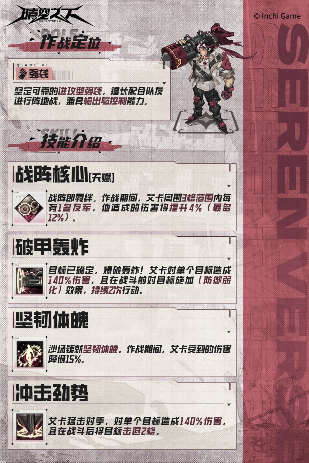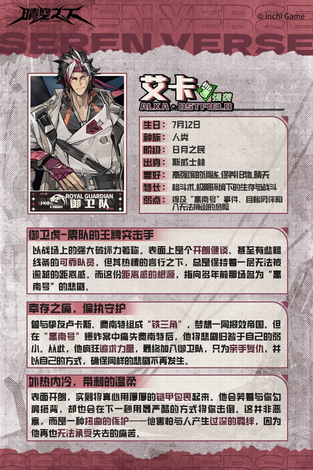 御卫虎-震队王牌队员,急性子,讲义气。艾卡的世界很简单:朋友,以及其他人。为了被他认可的伙伴,他可以化身最不要命的战士。