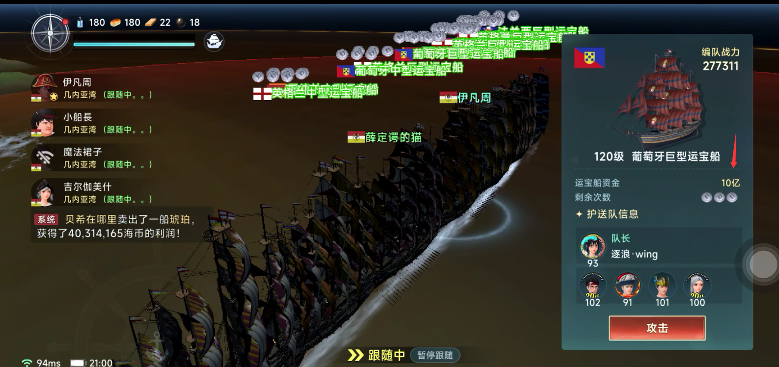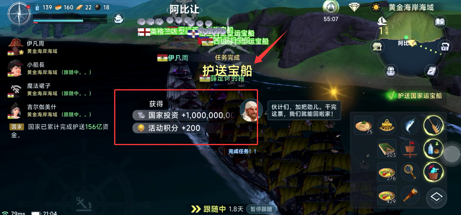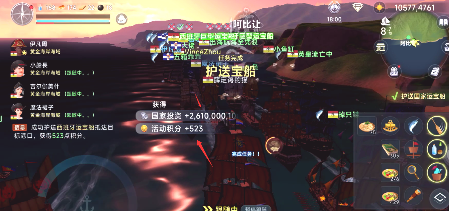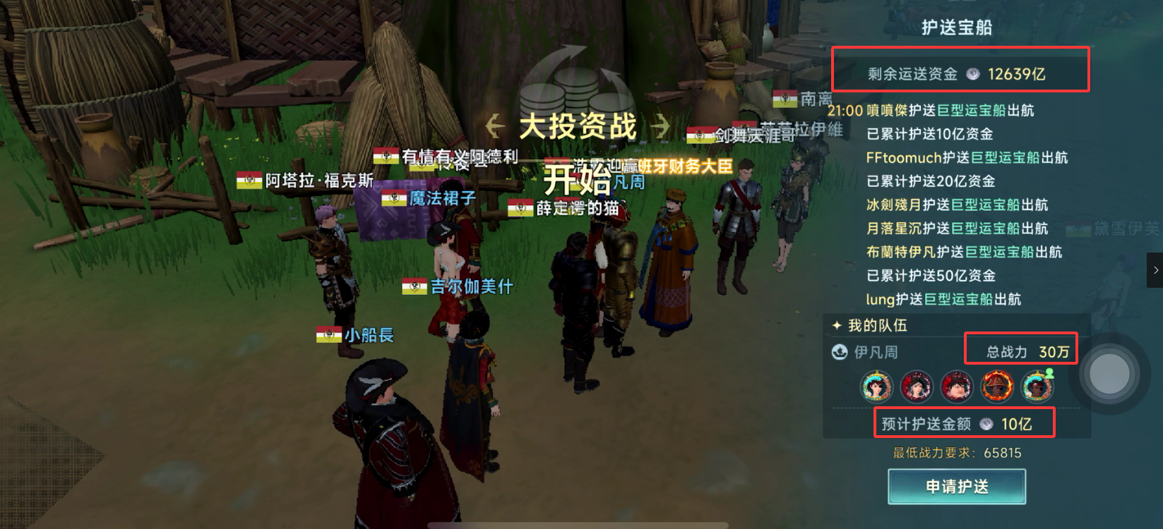 投资完了就可以等9点到支援港口开始宝船护送!队员全程跟随即可,队长会操作接取宝船任务。