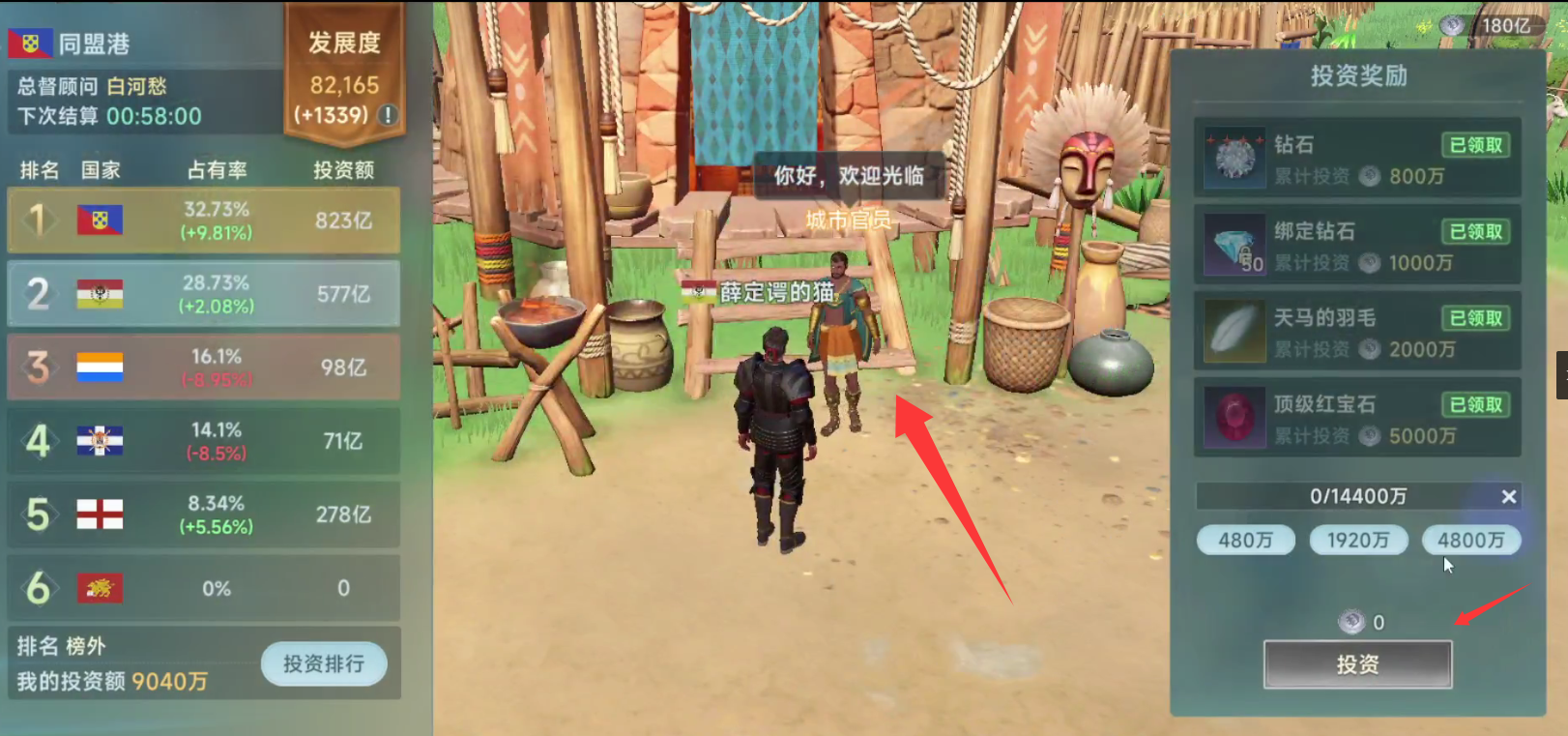 猫猫一开始8点就去投资了,去到任务投资港口直接投资!找到该港口的城市官员,直接投资!会获得积分和大量投资奖券哦。投资一亿海币大概100积分!