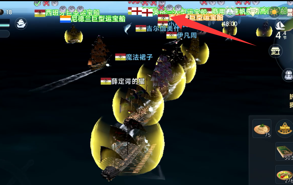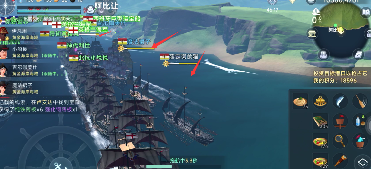 这时候宝船会自动往投资港口处航行,我们跟着宝船走即可。