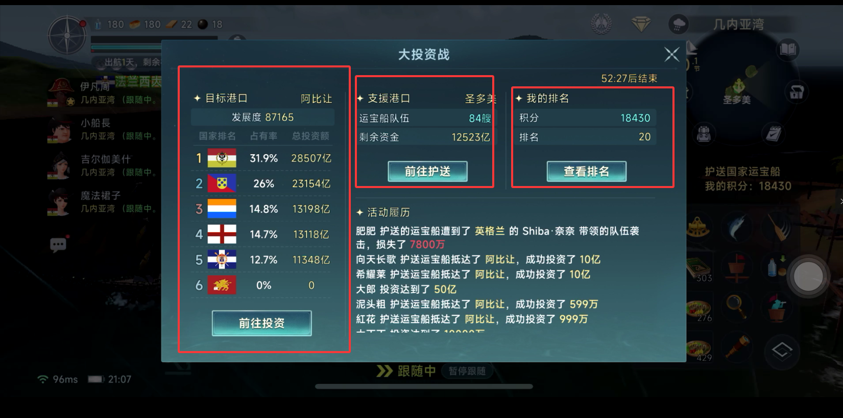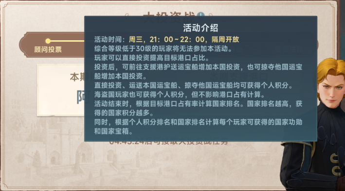大投资需要综合等级大于30即可参加。投资指定港口及去运送宝船或者打劫其他国家宝船都可以获得积分哦。最后根据个人排名及国家排名来结算奖励,奖励有国勋和国家贡献箱子呢。