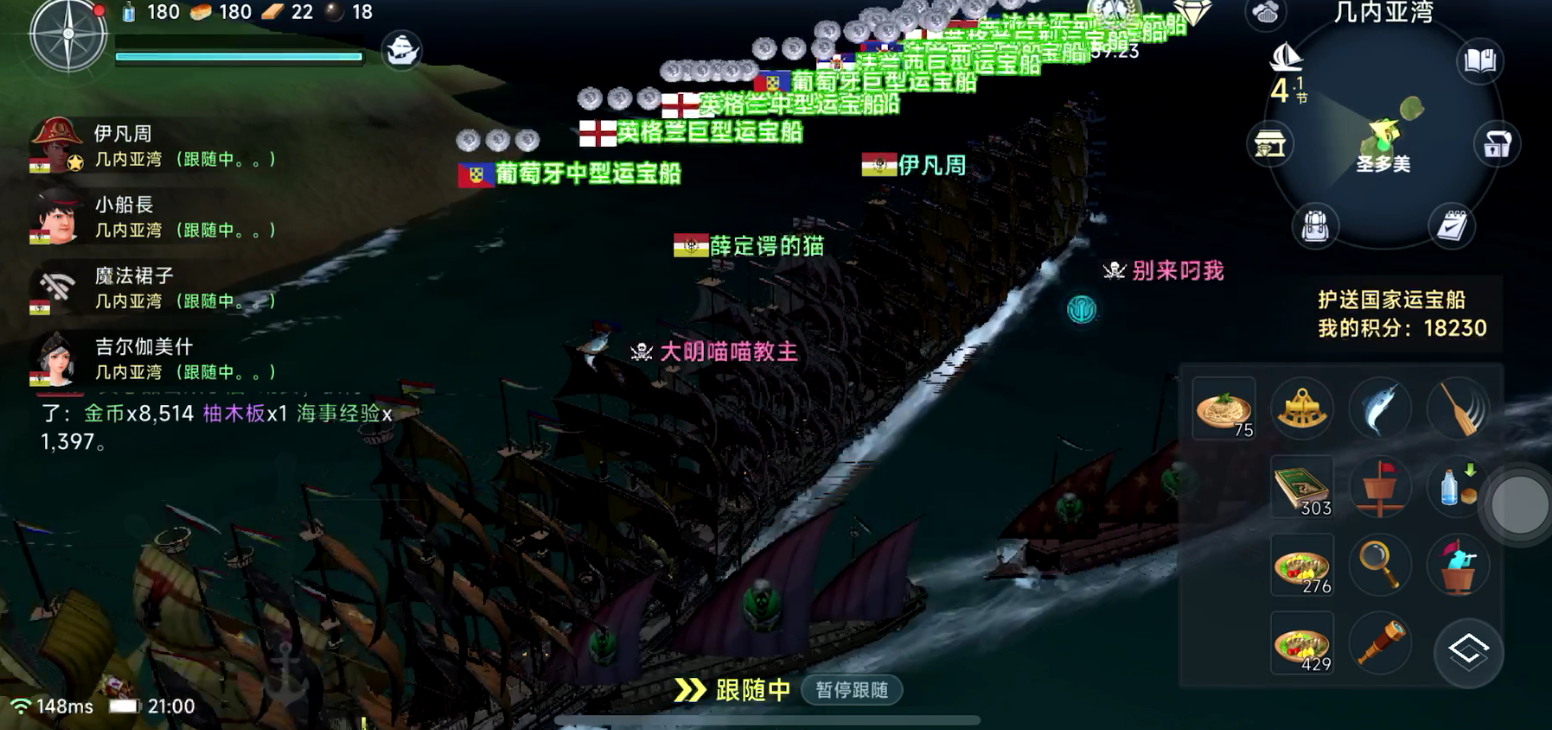 出港口都是密密麻麻的护送宝船队伍,周边还有些玩家蓄势待发要进行打劫宝船(真刺激)